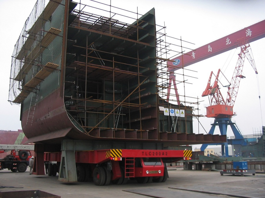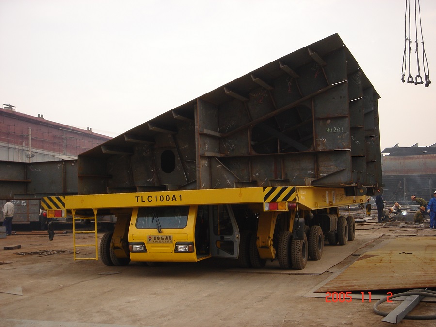 320T和500T液壓平板車拼車運輸造船部件(韓國)